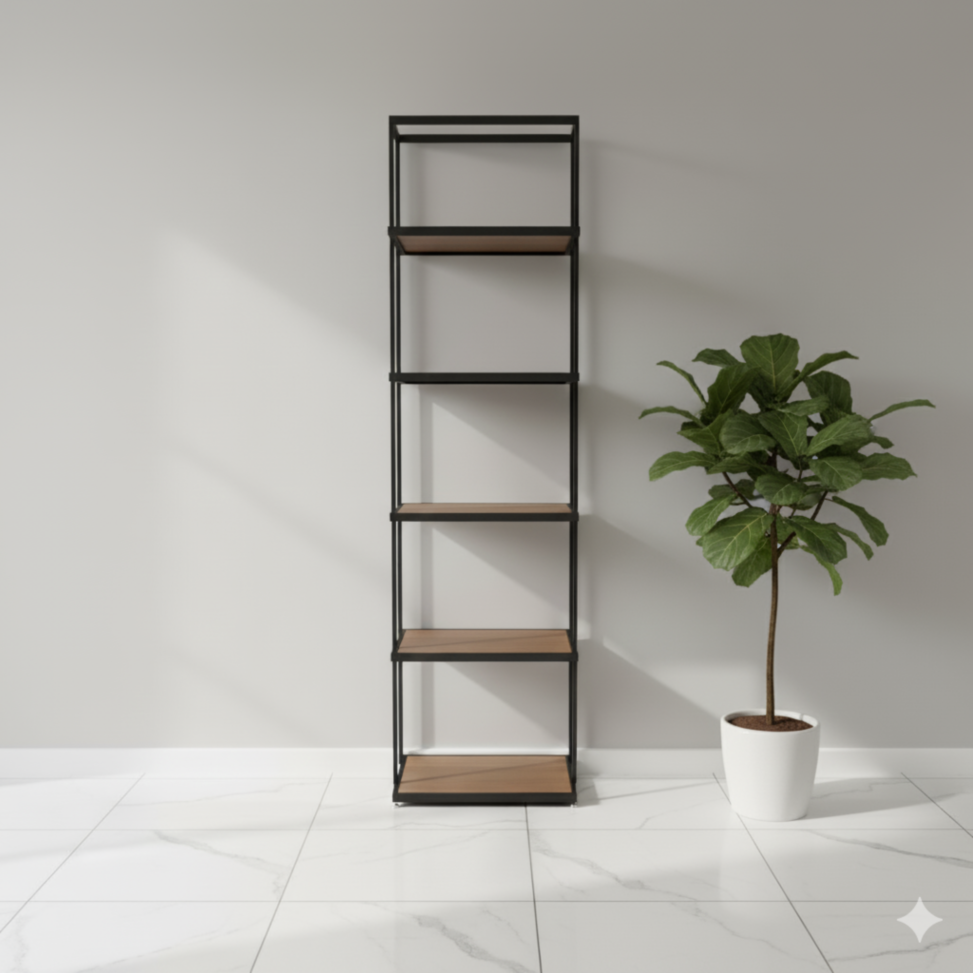 5 Ampi Ripiani: Con cinque ripiani a disposizione, avrai tutto lo spazio necessario per organizzare e valorizzare la tua collezione di libri, cornici e piante.